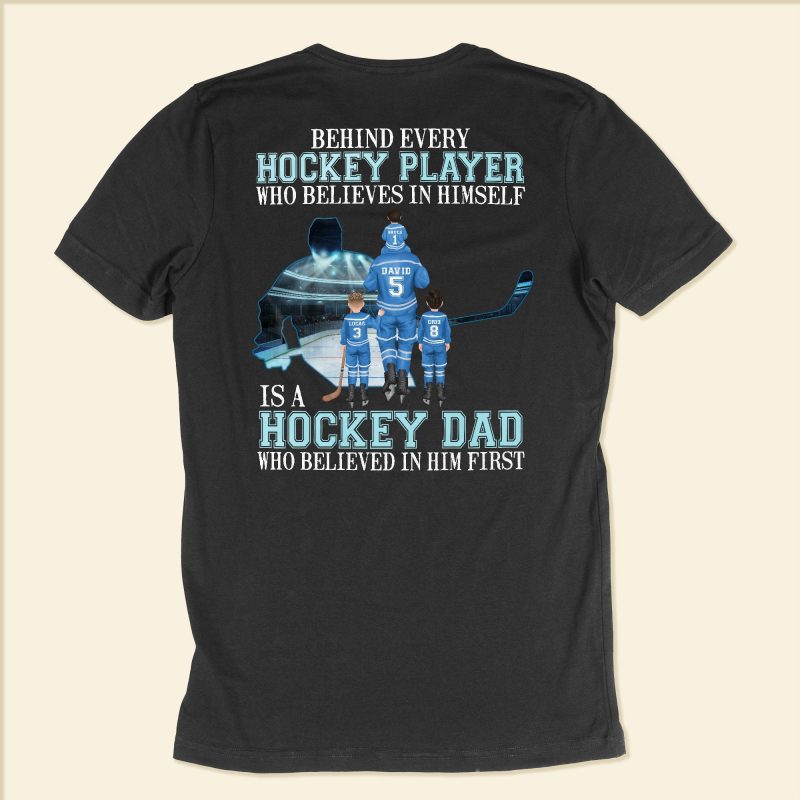 Behind Every Hockey Player Is A Hockey Dad Who Believed In Him First – PersonalizedOne Size Shirt – Father’s Day, Birthday, Hockey Gift For Dad, Father, Daddy – From Wife, Sons & Daughters
